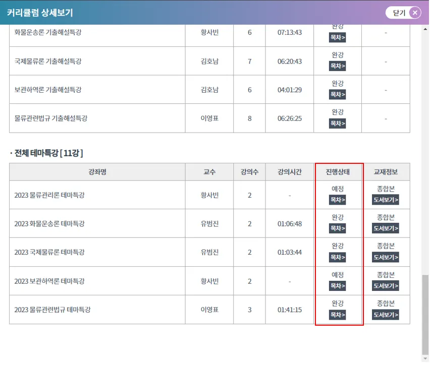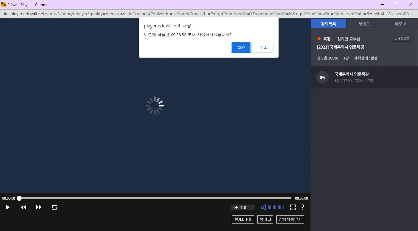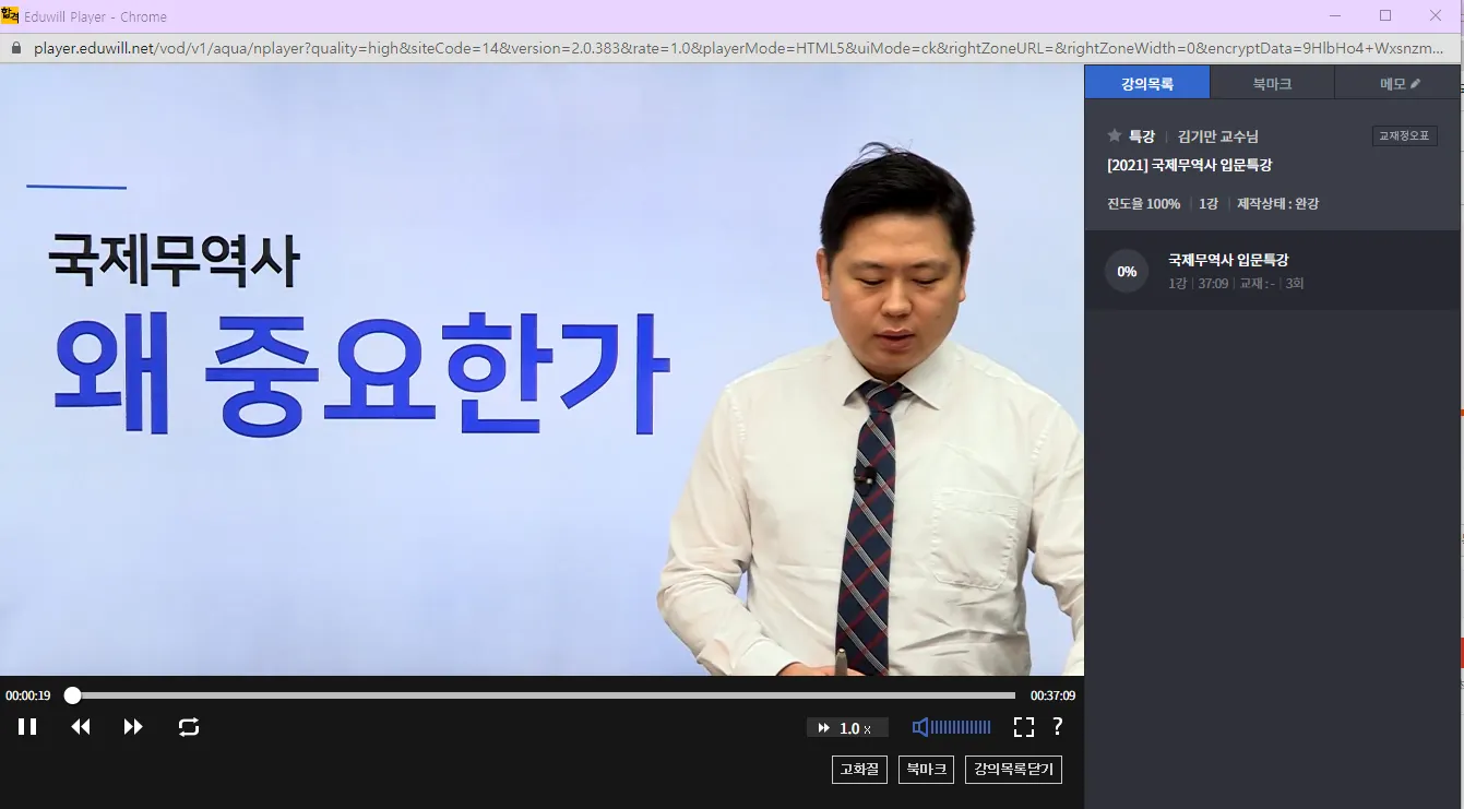 강의목록, 북마크, 메모, 화질선택(FULL HD,고화질), 즐겨찾기, 교재정오표, 진도율, 제작상태, 재생시간, 교재, 이전재생지점 로그(이전에 학습한 00:19:19 부터 재생하시겠습니까?)