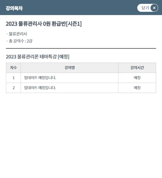 커리큘럼(목차) 상세보기 창에서 예정되어 있는 업데이트 내용과 현재 진행 상태를 확인할 수 있음.