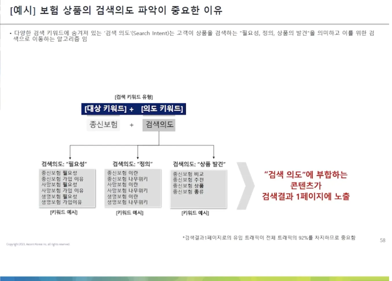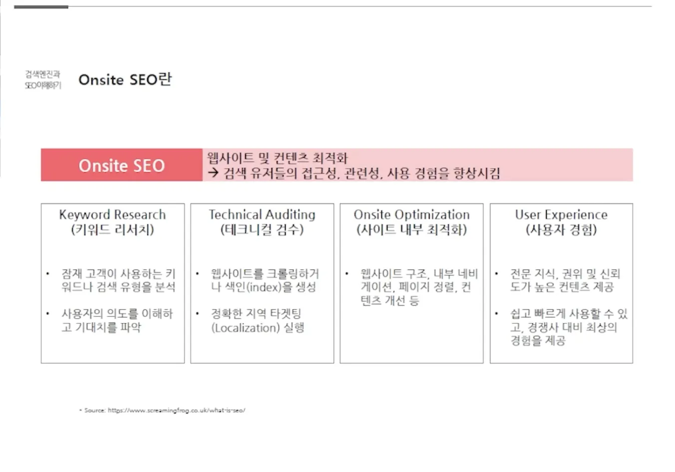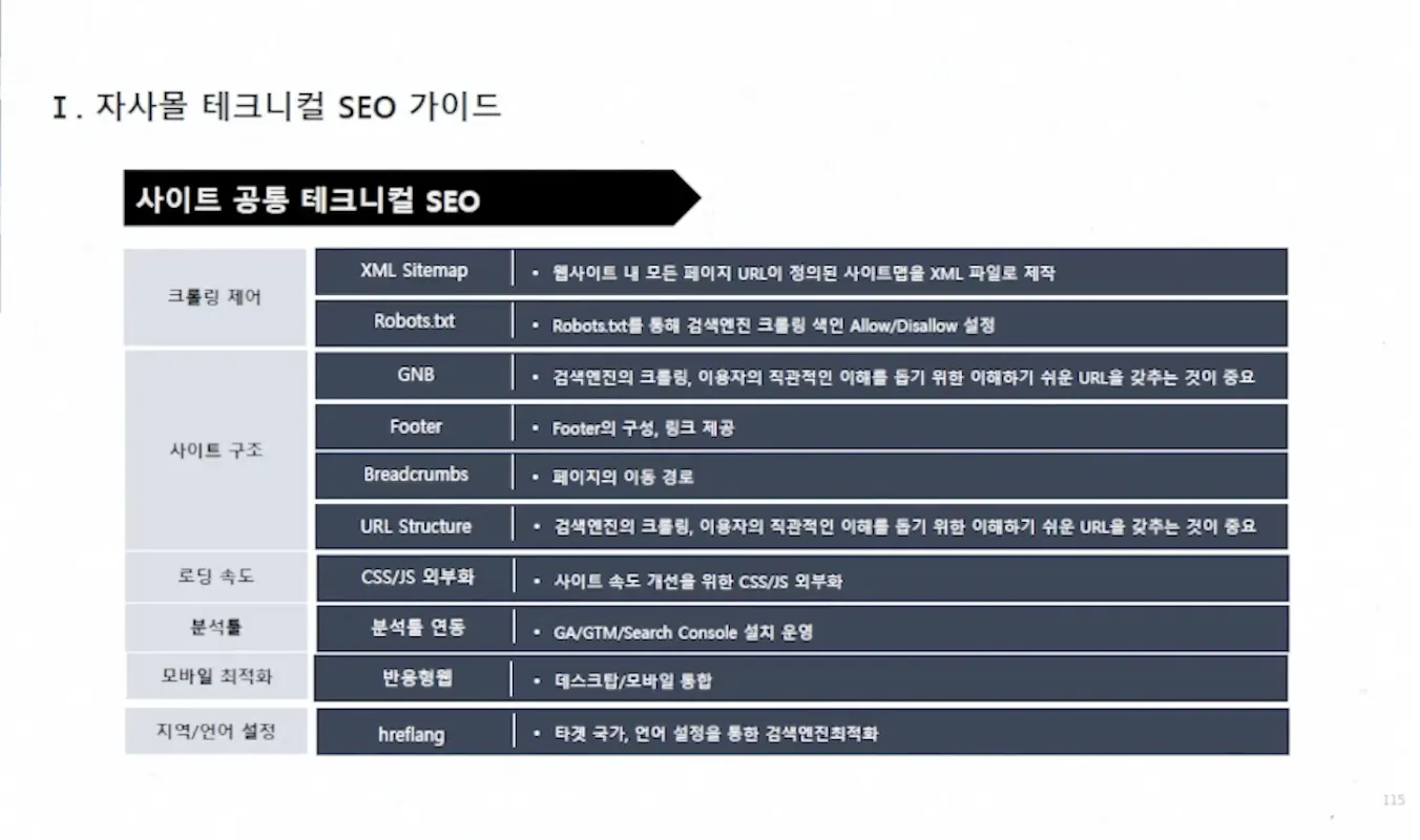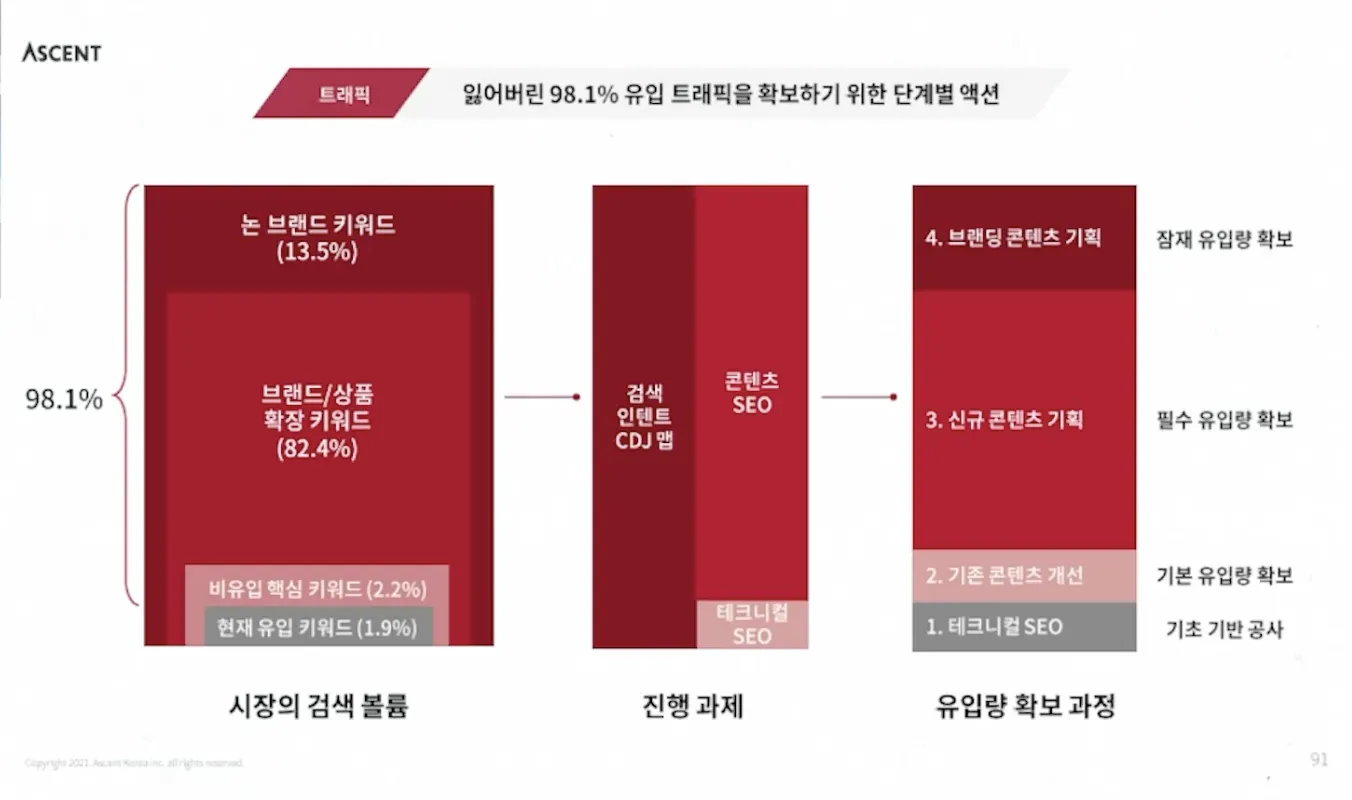 검색 의도에 가장 잘 맞는 컨텐츠의 포멧, 내용을 발행해야 함. 웹사이트 내 사용량 많은 페이지는 SEO를 통해 구글에서 검색이 잘 되도록 처리 해두어야 한다.