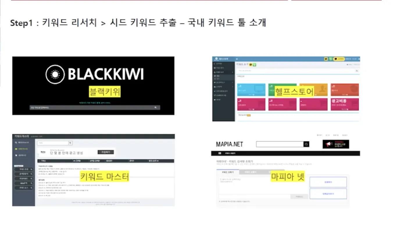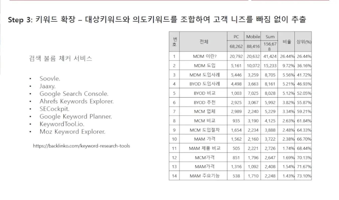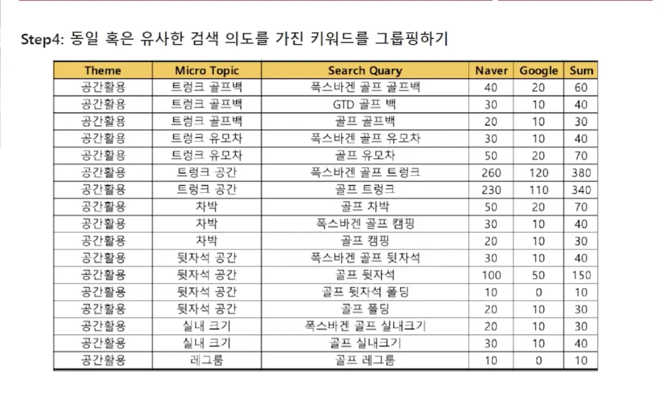검색볼륨 파악> 어떤 컨텐츠 만들지 파악 > 주요관심사 논리적 순서 연결 (징검다리 컨텐츠 제작 또는 하이재킹 가능) > 컨텐츠 상위 노출 > 경쟁사 대응 현황 파악 (당사 vs 경쟁사) > 의도에 맞는 컨텐츠 포멧을 결정(동영상, 이미지, 텍스트) >다른 전문 매체가 컨텐츠 제작하고 있다면 채널 리스팅