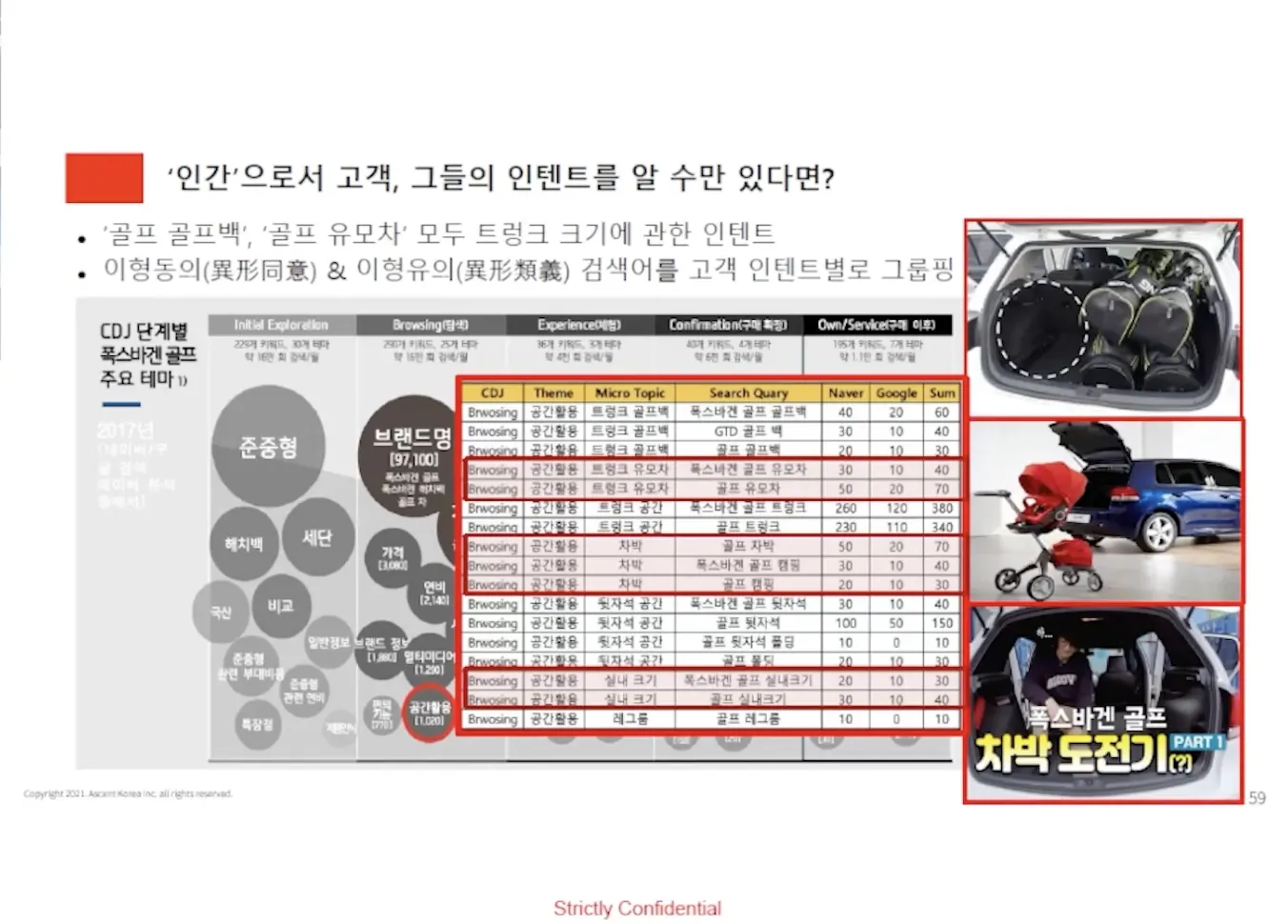 폭스바겐 골프백의 공간 활용에 대한 검색어임 > 제조사의 상세페이지에 골프백 트렁크 공간을 미터로 표현해놓은 정보가 고객의 검색의도와 맞지 않는 것으로 구글이 인식함. 고객은 골프백이 몇개 들어가는지, 유모차가 들어가는지가 궁금한 것이지 절대적인 수치가 궁금한 것이 아님.