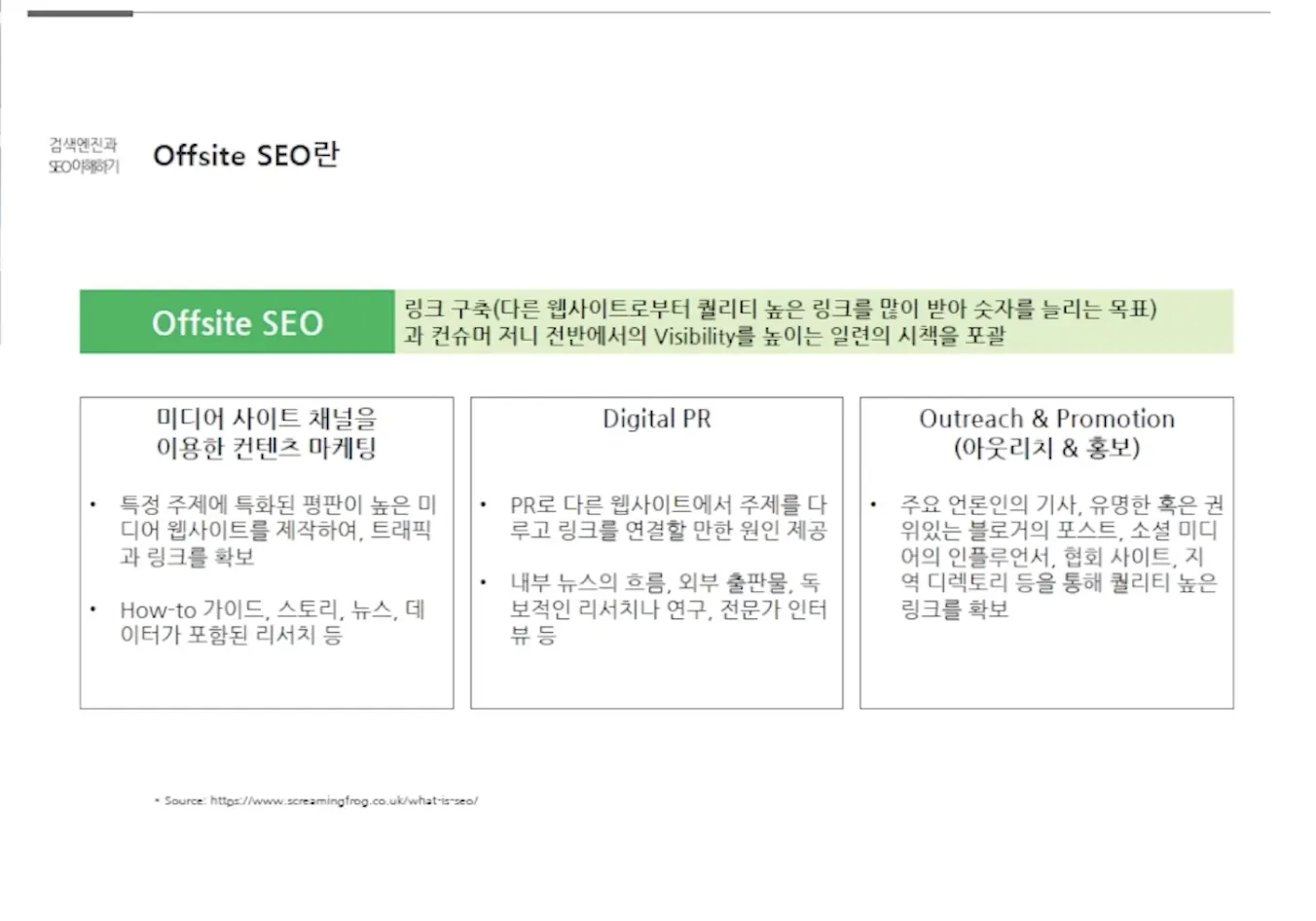 페이지 랭크 : 주변에서 나를 어떻게 평가하는지, 누가 나를 인용하는지에 따라 사이트 점수가 올라감. 주제에 맞는 다른 웹사이트나 미디어를 만들어 서로 상호보완적인 존재가 되도록(백링크)
