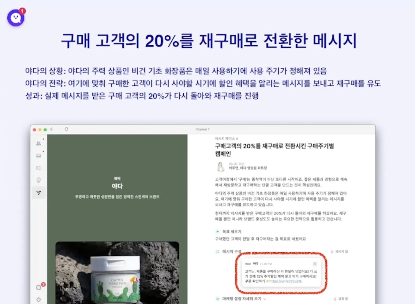 화장품 구매 주기에 맞춰 고객이 다시 돌아오게끔 전략을 수립하고 구매 주기에 맞춰 문자, 이메일 등으로 접촉 > 20% 고객이 다시 돌아와서 구매로 연결 > 메시지 개인화 변수 사용 가능(이름 들어가게 할 수 있음) 리마인드를 통한 리텐션 가능
