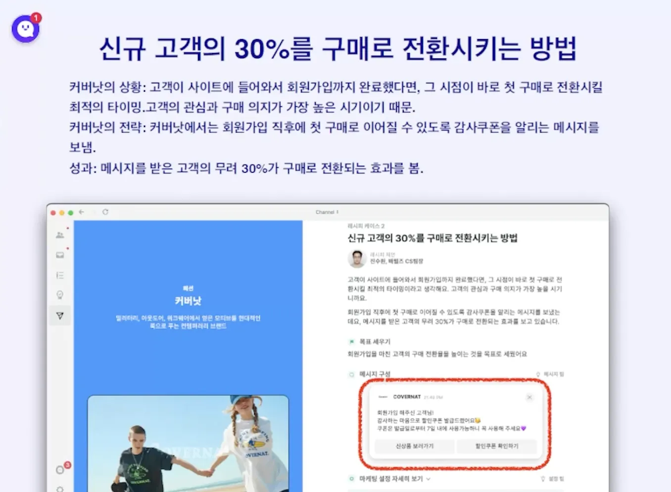 CRM은 CS에 포함되기도 한다. 커버낫에서는 CS팀이 담당. 회원가입 즉시 쿠폰 사용 알림 > 매출 증가