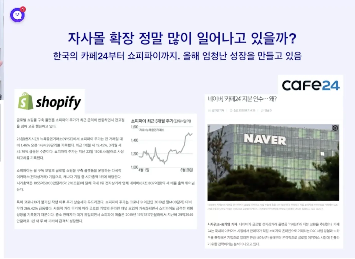 자사몰 운영 시 홈페이지가 반드시 필요하고 개발자 없는 경우 빌더사 사용함(카페24, 쇼피파이 등)