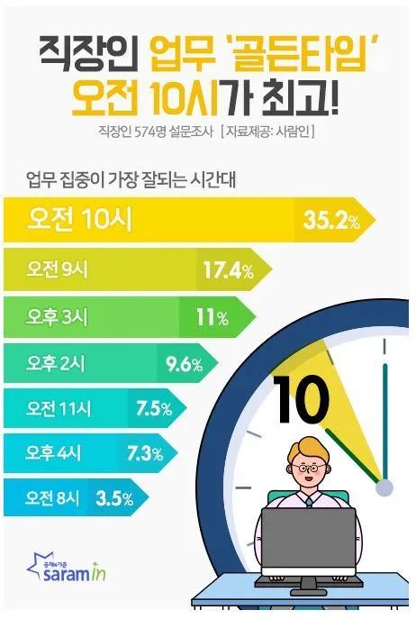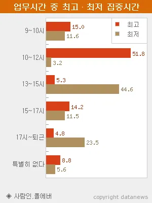 아침 10시~11시 반, 오후 2시~4시, 차 또는 커피 한잔하면서 일할 때, 메신저 조용할 때(사담/업무 모두 포함)