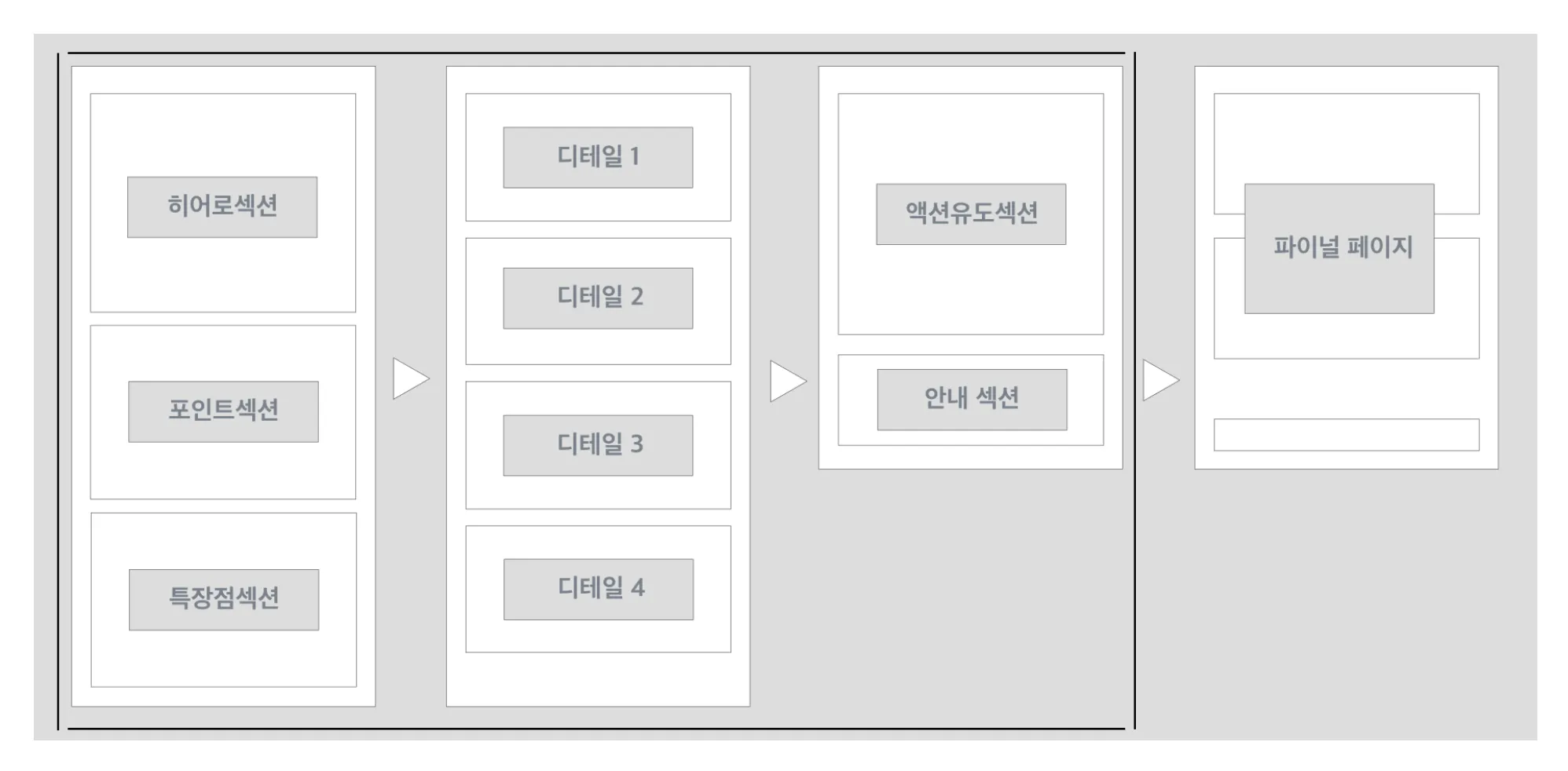 간혹 '요즘 랜딩 페이지의 트렌드는 무엇인가요?'라고 질문해주시는 분들도 계세요. 만드는 방식에 따라 액션 유도 섹션을 중간에 몇 개 더 넣을 수도 있고, 포인트 섹션 없이 바로 디테일 섹션으로 들어갈 수도 있거든요.