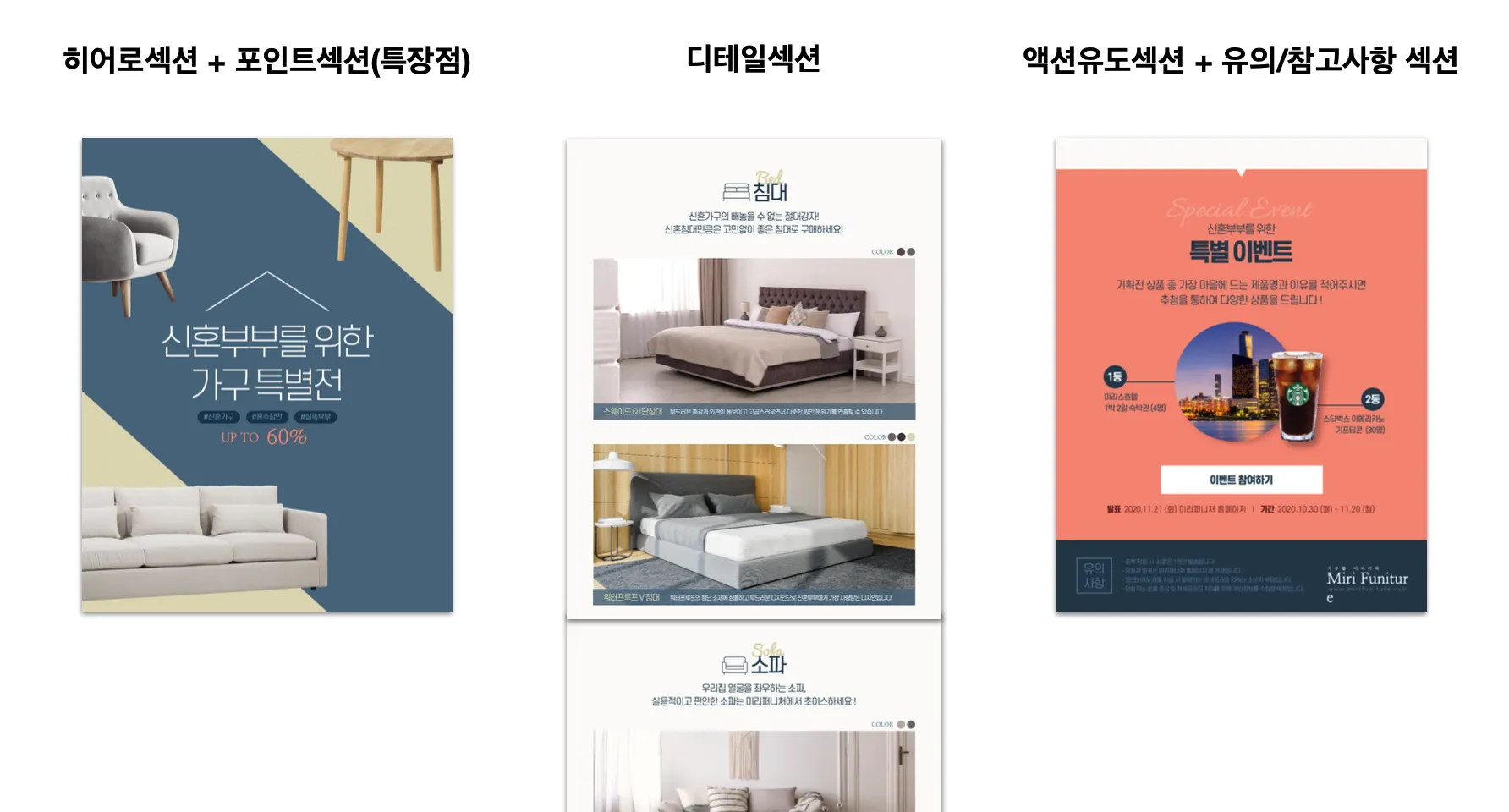 그다음으로는 상품에 관한 디테일한 설명을 나타내는 디테일 섹션이 있고요. 마지막으로 하단에 고객의 액션을 유도하는 섹션으로 구성됩니다.