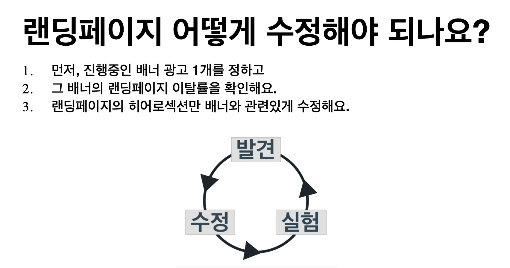 랜딩 페이지 수정 단계에서 가장 중요한 것은 한 번에 여러 곳을 수정하지 않는 것입니다. 아예 전체를 갈아엎는다고 드라마틱하게 이탈률이 떨어지지 않습니다. 발견과 실험, 수정이라는 단계를 반복적으로 거쳐 필요한 부분을 수정하는 것이 효율적입니다.