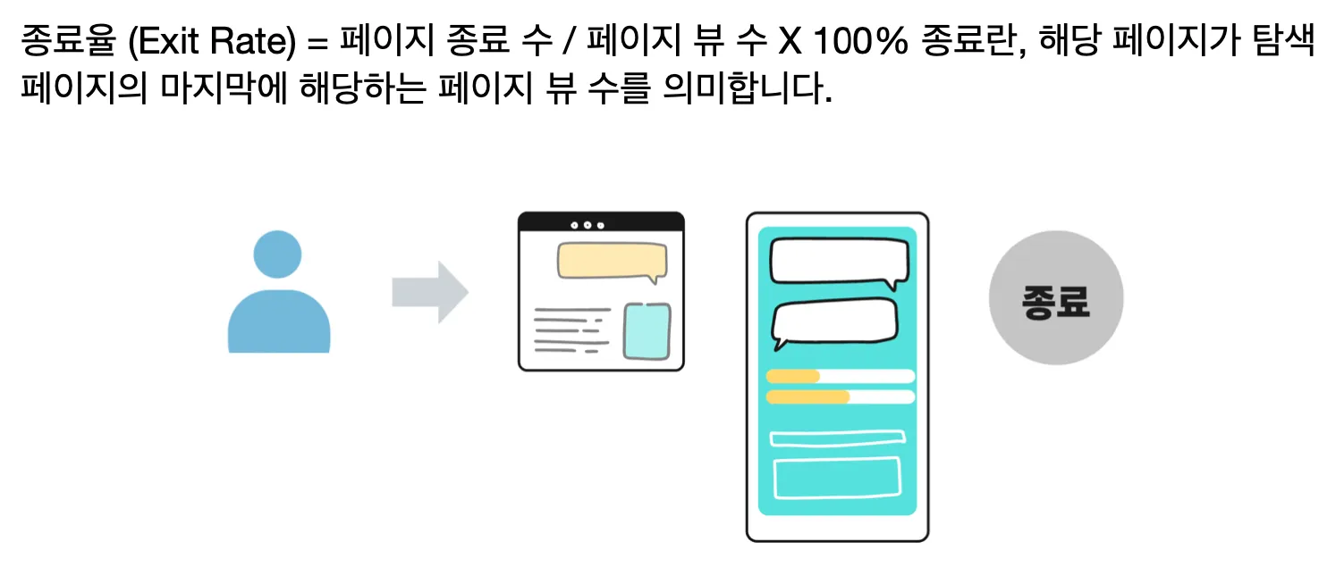 종료율은 이탈률과 다르게 고객이 앞선 페이지를 살펴본 후 웹사이트를 떠나는 마지막 시점에 계산됩니다.