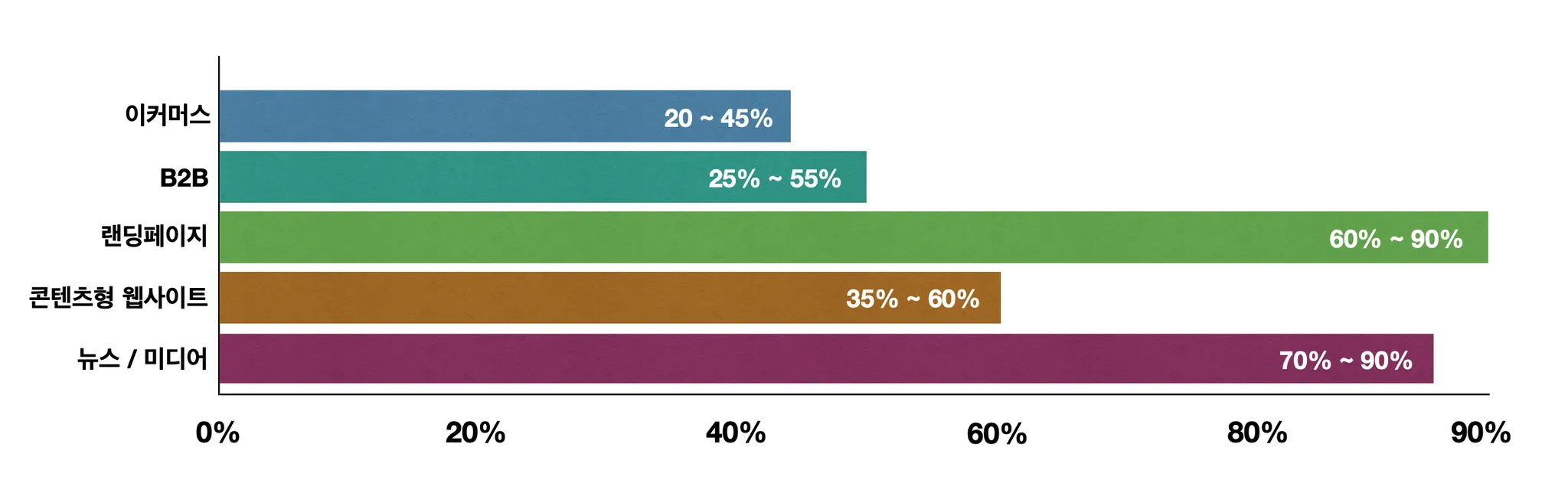 평균 랜딩 페이지 이탈률은 얼마나 될까요? 아래의 이미지를 보시면 랜딩 페이지의 이탈률이 60~90%로 다른 유형에 비해 폭과 정도가 월등하게 높은 것을 확인하실 수 있습니다.