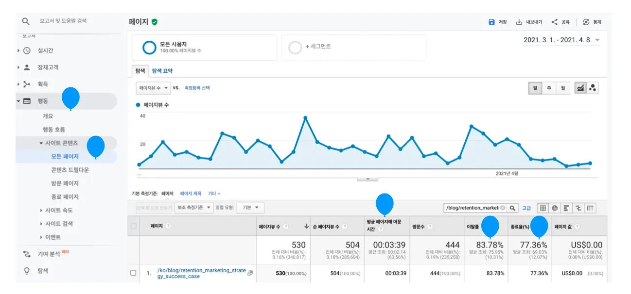 웹사이트 분석을 위해서는 중요한 지표를 확인할 수 있는 'GA(Google Analytics, 구글 애널리틱스)'를 보편적으로 많이 사용합니다. 본격적인 이야기에 앞서 랜딩 페이지 분석에 활용할 수 있는 주요 지표를 소개할게요.