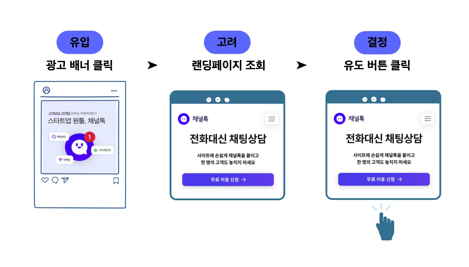 광고를 기획한 다음 광고 이미지를 클릭해 랜딩 페이지로 연결된 후, 어떤 형태의 CTA* 버튼을 눌러 어떤 페이지로 연결되게 해야 할지 등의 과정을 그려보는 것입니다. 이렇게 미리 여정을 계산해야 훨씬 더 매끄러운 랜딩 페이지를 만들 수 있습니다.