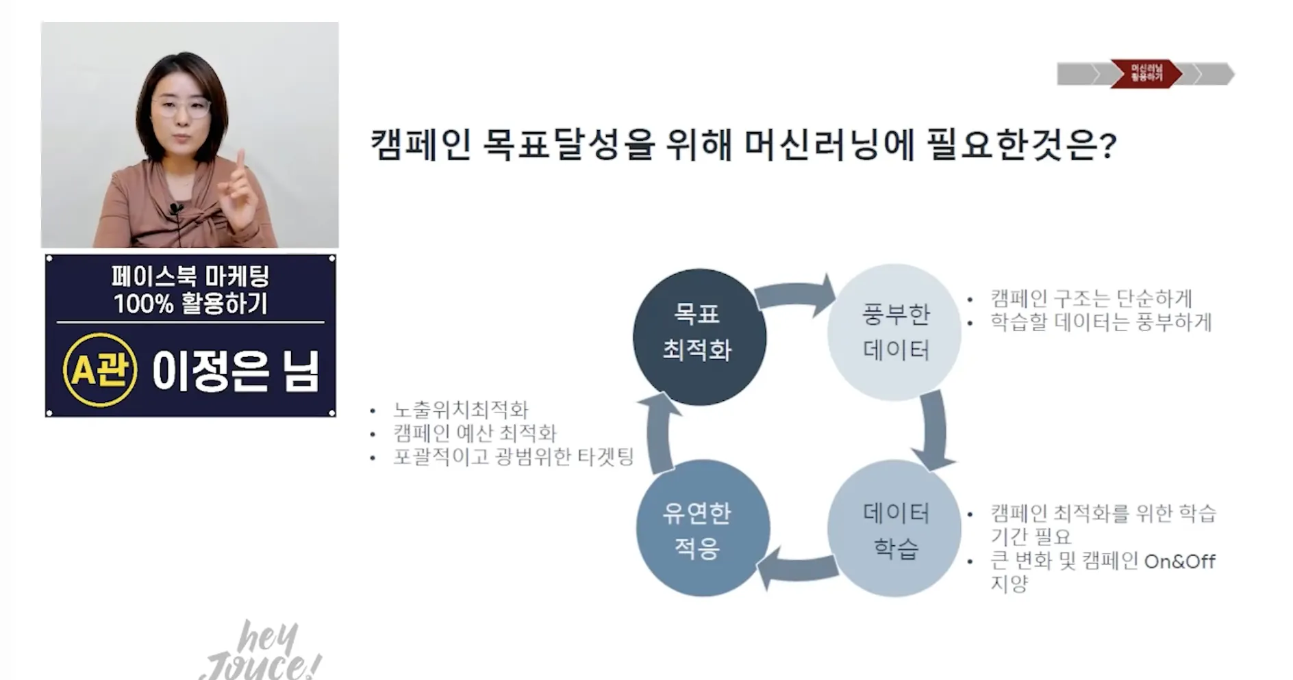 머신러닝 : AI의 하위개념. 데이터 해석, 학습, 유연한 적응을 통해 특정 목표와 작업을 달성하는 시스템의 능력. 캠페인 최적화를 위해서는 학습 데이터가 풍부할 수록 좋다. 캠페인 on/off 가 잦을수록 학습기간이 지연됨. 변화는 점진적으로. 타겟 범위를 넓혀야 머신러닝이 학습 후 유연하게 적용할 수 있다.