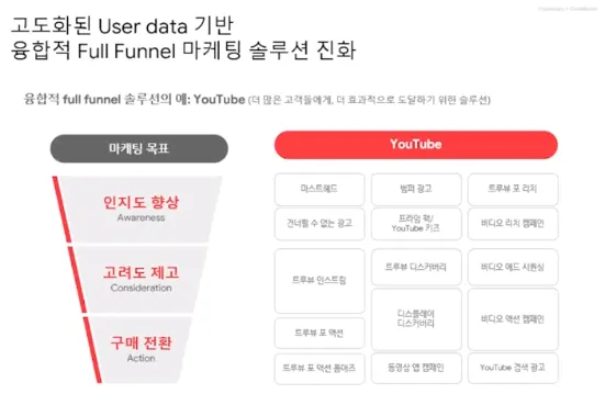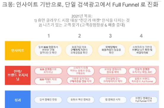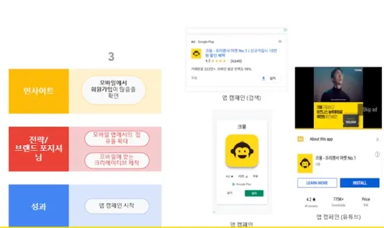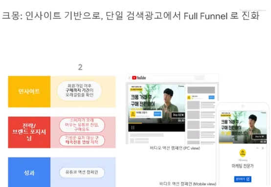 A. 구글 애즈 시작할 때 검색광고부터 시작>유저데이터 축적하고 추후에 비디오 광고로 확대. 초기에는 매출 견인에 초점을 맞추다가 브랜딩으로 확대.