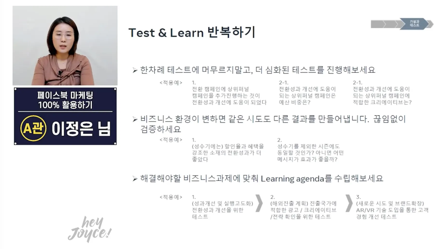 테스트 많이 하는게 제일 좋지만. 구매전환으로 캠페인할 때는 금액이 크다. 이런 경우에는 구매전환 이전 단계의 목표설정으로 금액을 줄여라. (캠페인 규모 적게 테스트) 크리에이티브 변별력 테스트의 경우는 CTR만 체크. 러닝용 예산을 5%~10%든 따로 빼두고 운영하라.