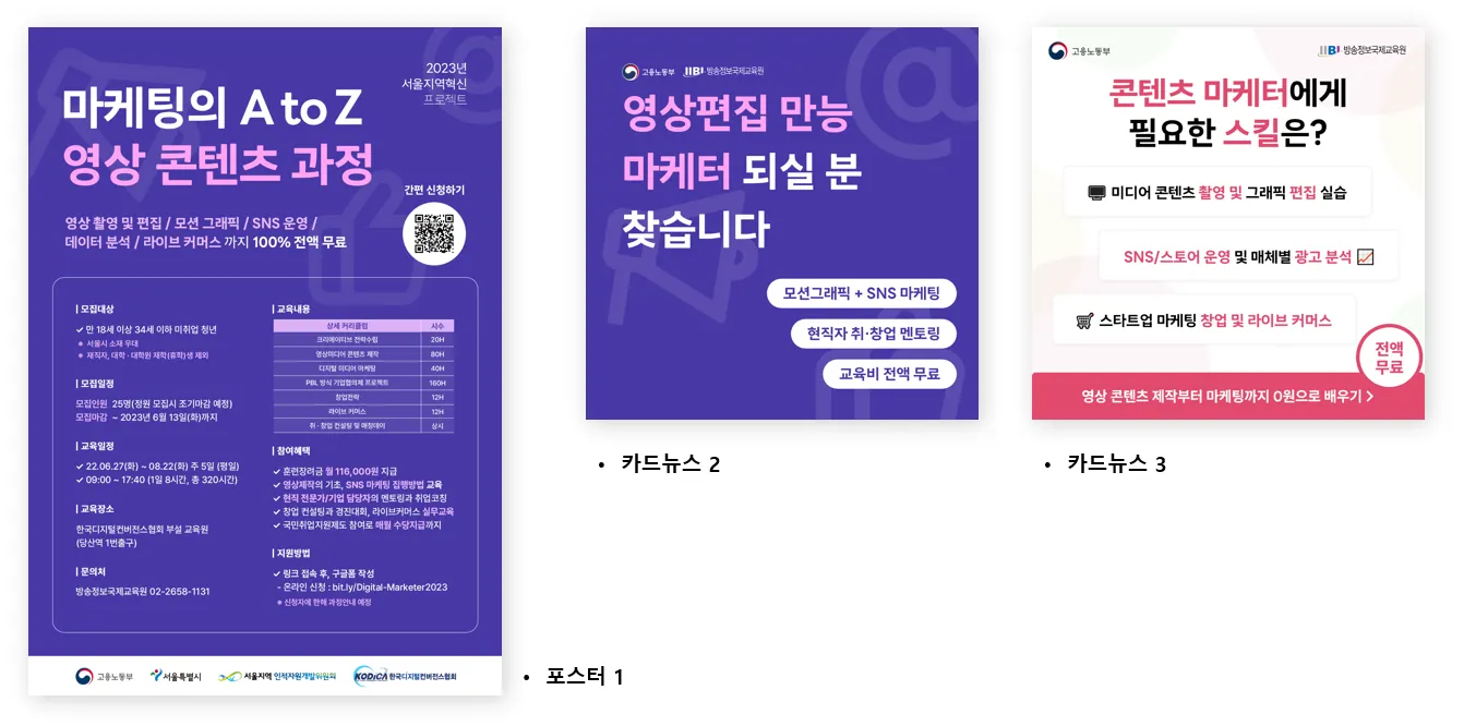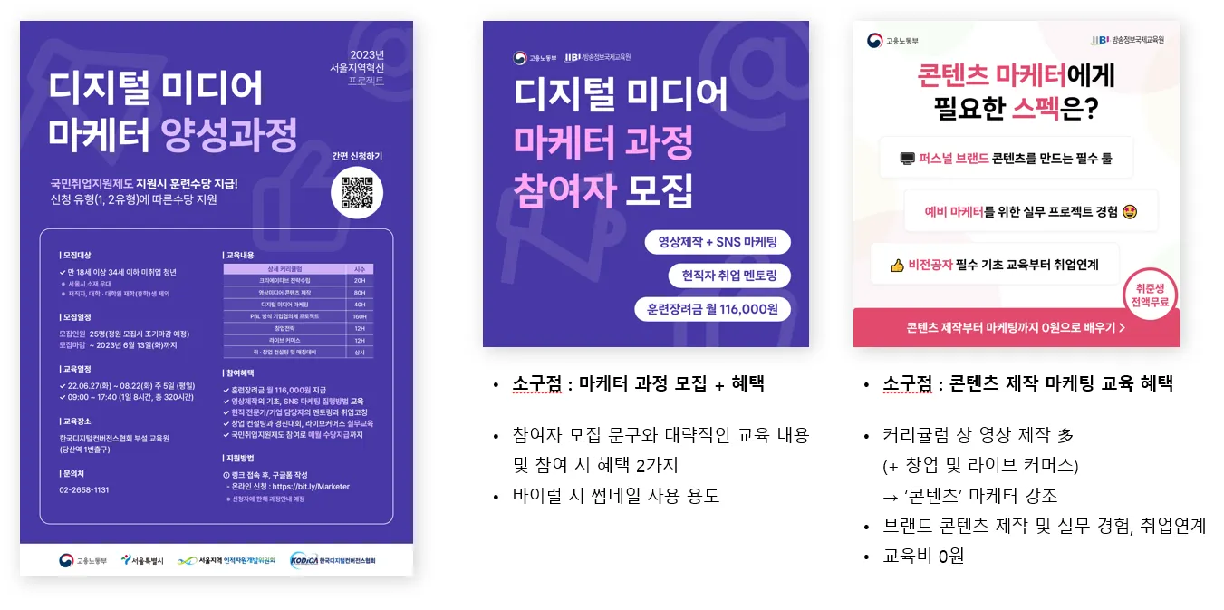 카드뉴스 소재 2개 다 마찬가지로 디지털 미디어 마케터 과정 참여자 모집 이 카피만으로 클릭률이 높아질 거라는 생각이 들지 않습니다.